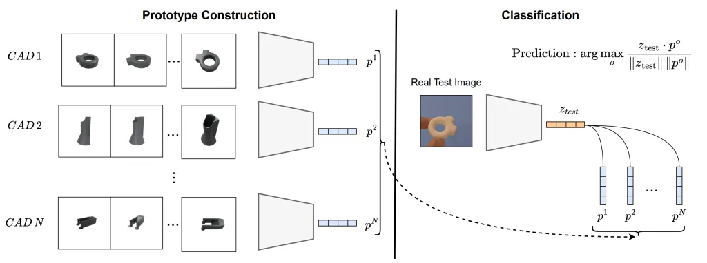 该方法并非在引入新零件时重新训练模型,而是利用CAD模型渲染出的多个视图为每个物体构建一个原型表征。