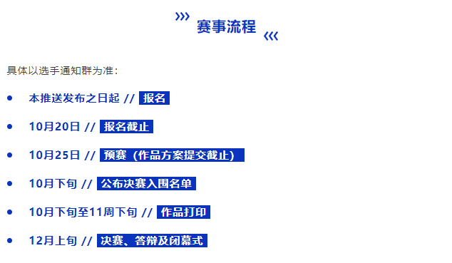 预赛作品方案提交截止日期为10月25日,决赛及闭幕式将于12月上旬举行。