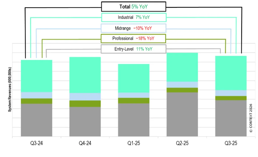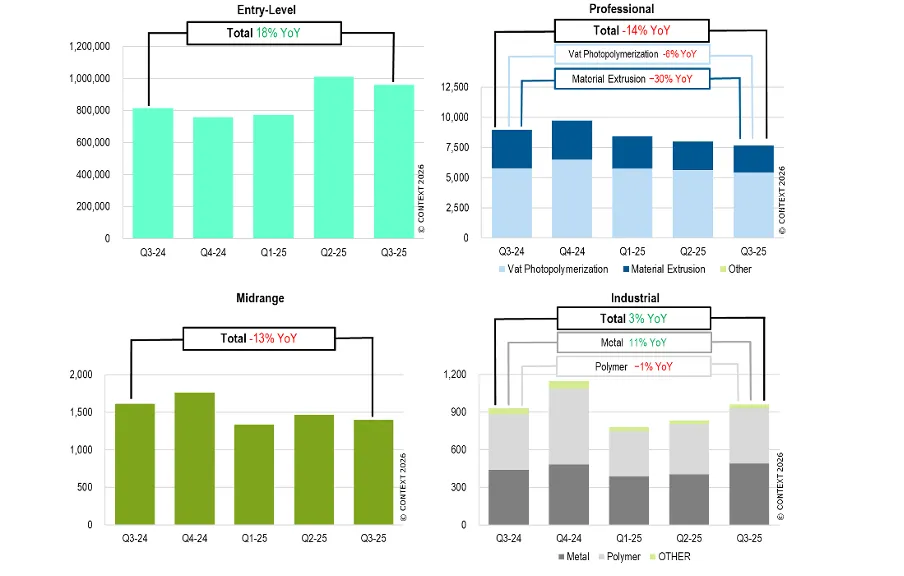 市场情报公司CONTEXT发布的最新数据显示,2025年第三季度,全球3D打印硬件市场呈现显著的两极分化格局,总体营收同比增长5%。