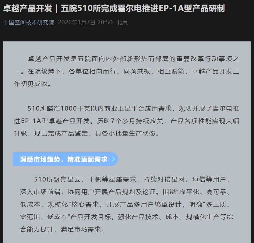 从设计创新到工艺突破,从性能跃升到产能储备,EP-1A型产品的成功研制,标志着我国航天电推进正加速迈向高性能、低成本、规模化的新阶段。