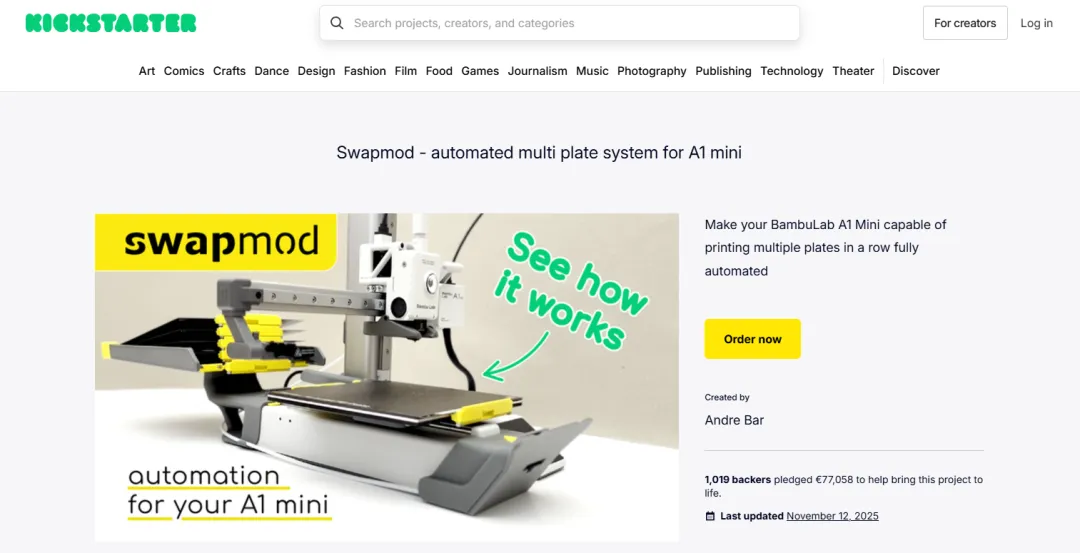 那套东西也在Kickstarter上众筹成功了。但Swapmod是Andre独立为拓竹A1 Mini重新设计的版本,结构更简单,可靠性更高。
